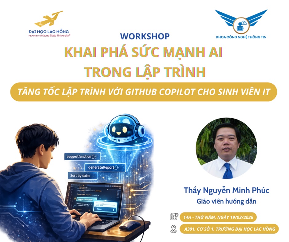 Nhằm tạo điều kiện cho sinh viên tiếp cận và khai thác hiệu quả các công cụ trí tuệ nhân tạo (AI) trong học tập và lập trình, Khoa Công nghệ Thông tin – Trường Đại học Lạc Hồng trân trọng thông báo tổ chức workshop với chủ đề: Khai phá sức mạnh AI trong lập trình.