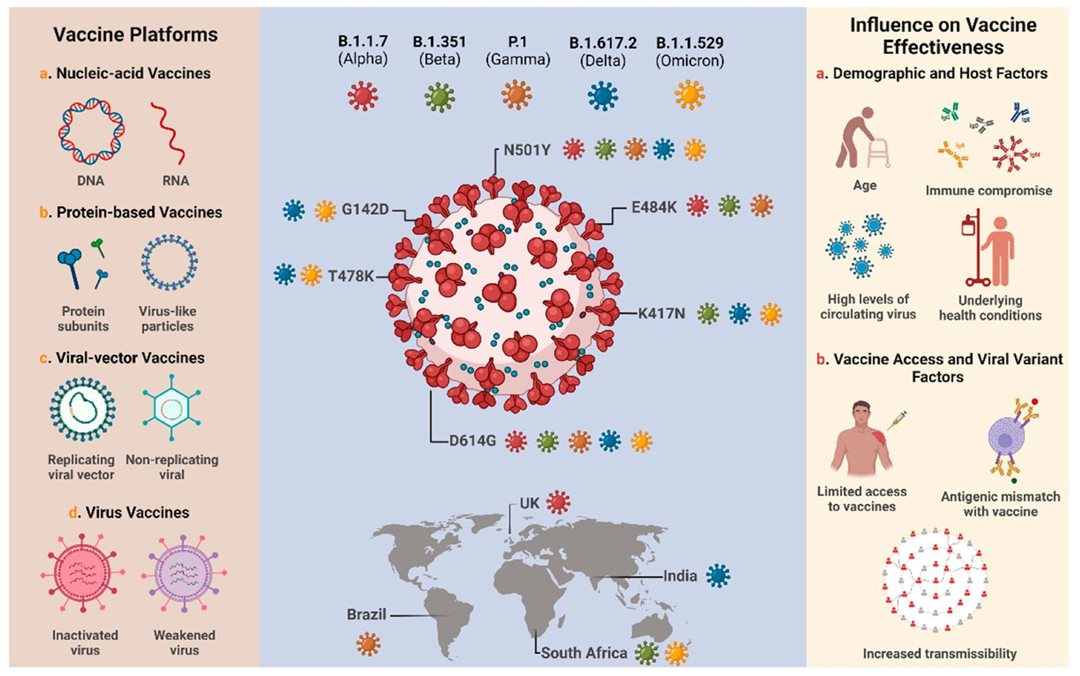 Figure 1. Overview of the major technology platforms used for COVID-19 vaccine development, the SARS-CoV-2 variants of concern and their respective spike protein mutations, and the factors that may influence the effectiveness of available vaccines.